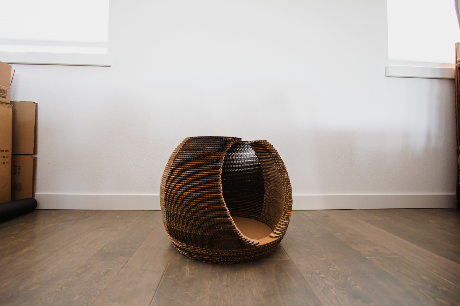 A personal project where I wanted to design and build a little sleeping spot for one of my cats. Used 3D Rhino to generate laser cut files and glued pieces together to form spherical shape.